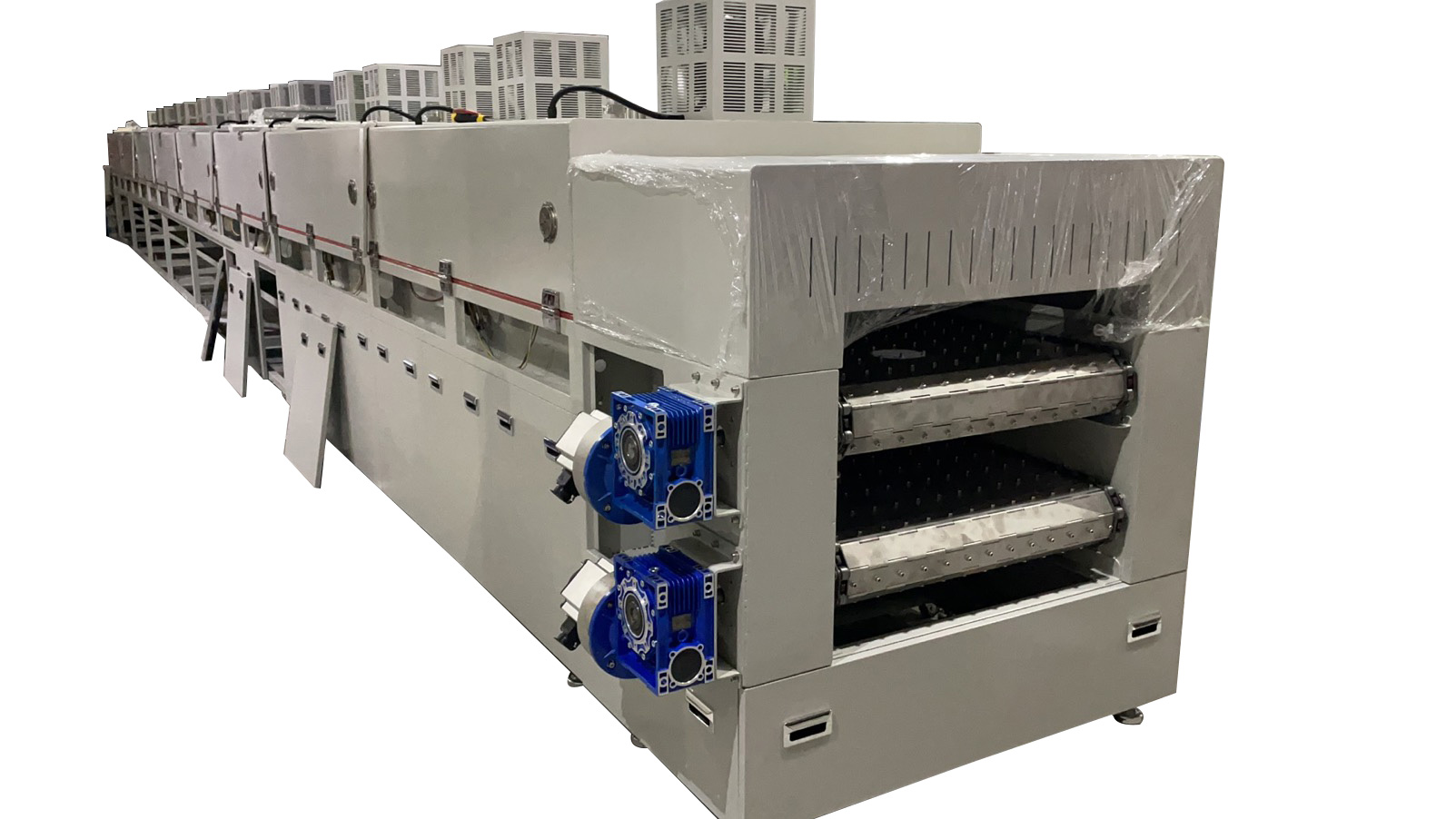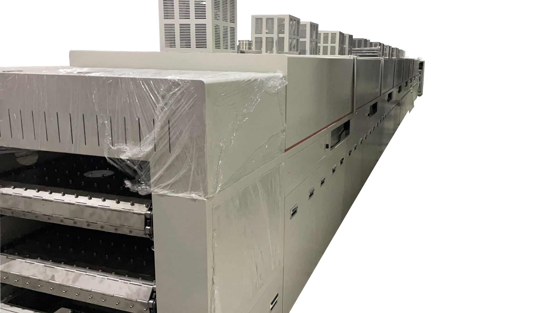 目前,傳統的隧道烤爐均采用紅外線和發熱管加熱方式,且多為平鋪式結構。這種方式易造成區域加熱不均,即加熱產品受熱不均,內部環境潔凈度難以控制,為達成烘烤時間和產能,需要布局較長的產線,占用廠房面積較大,同時能源的損耗也非常大,無法滿足節能、高效的生產要求。