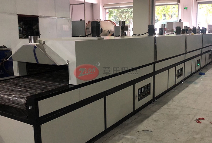 1、爐部分外形尺寸:線體總長12米,網帶寬1.0米,總高1.6米,出料部分長1米,烘干部分長10米,分為5段,進料部分長1米,冷卻區為0.4米,線體大梁支架和箱體外殼采用2.0㎜厚冷板折彎而成,整機外殼高溫靜電噴塑(非普通油漆)耐腐蝕易清洗,機架用50×50㎜方通焊接而成,配16㎜調節腳杯。